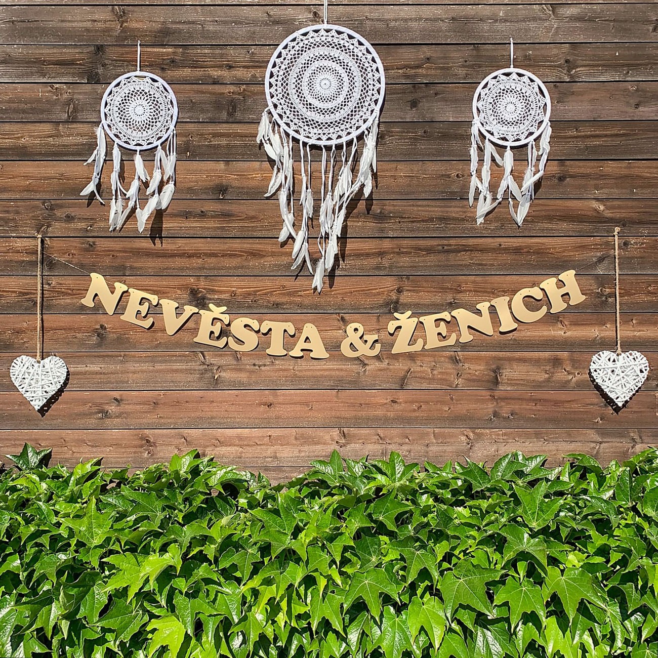 Papírová girlanda s textem NEVĚSTA & ŽENICH je vhodnou svatební dekorací.