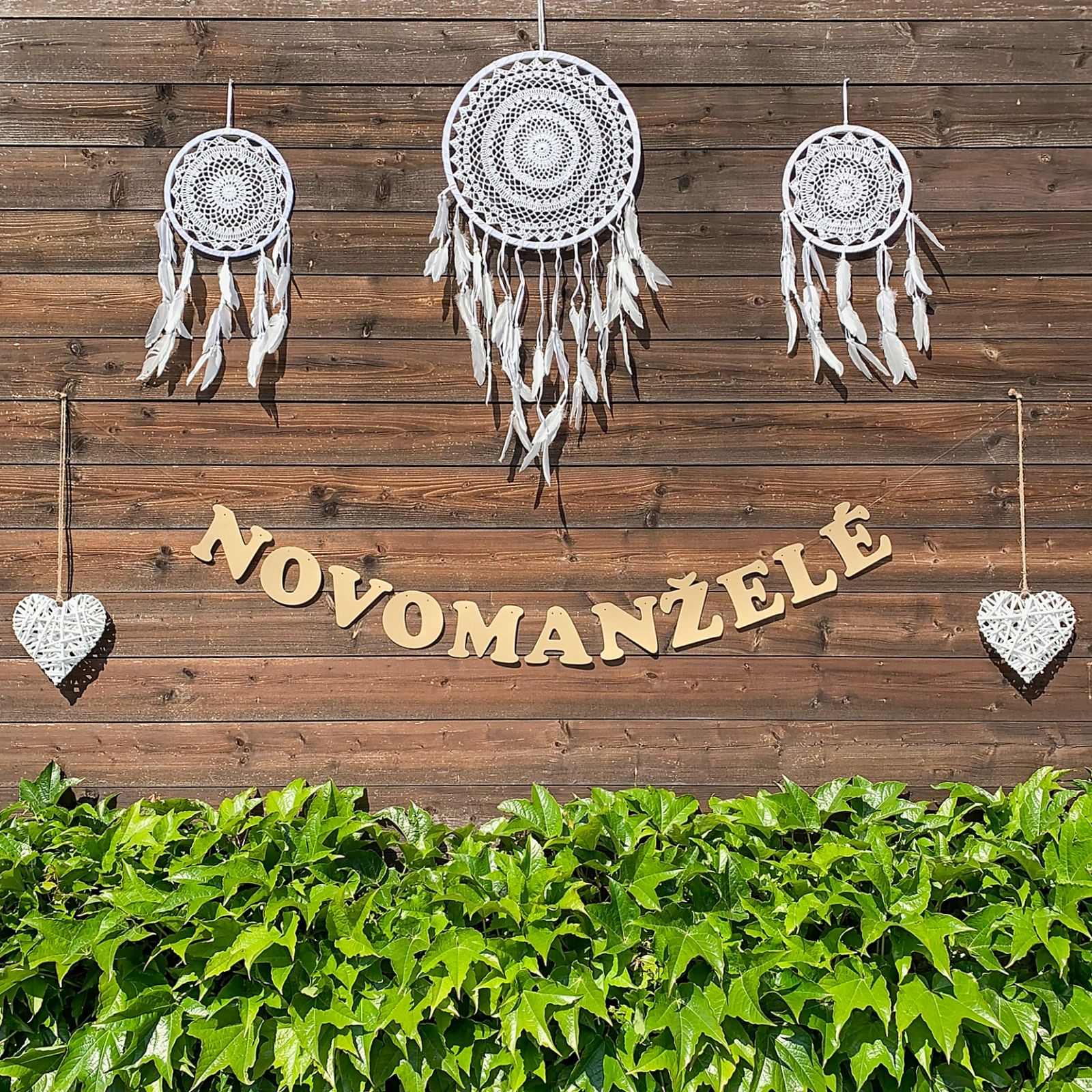 Papírová girlanda s textem NOVOMANŽELÉ je vhodnou svatební dekorací.