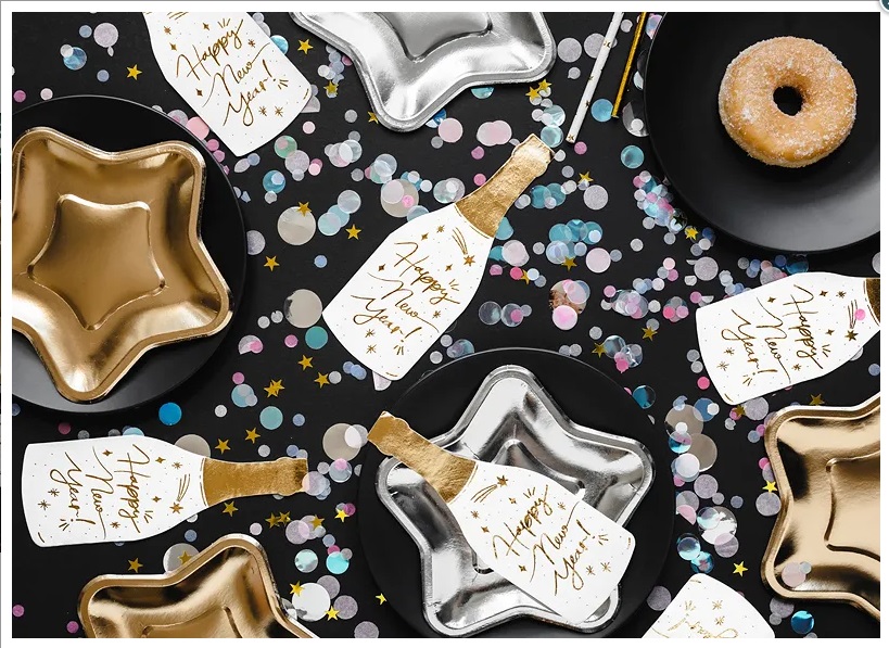 Papírové ubrousky ve tvaru Champagne v bílé barvě se zlatými detaily. Vhodné pro novoroční oslavy.