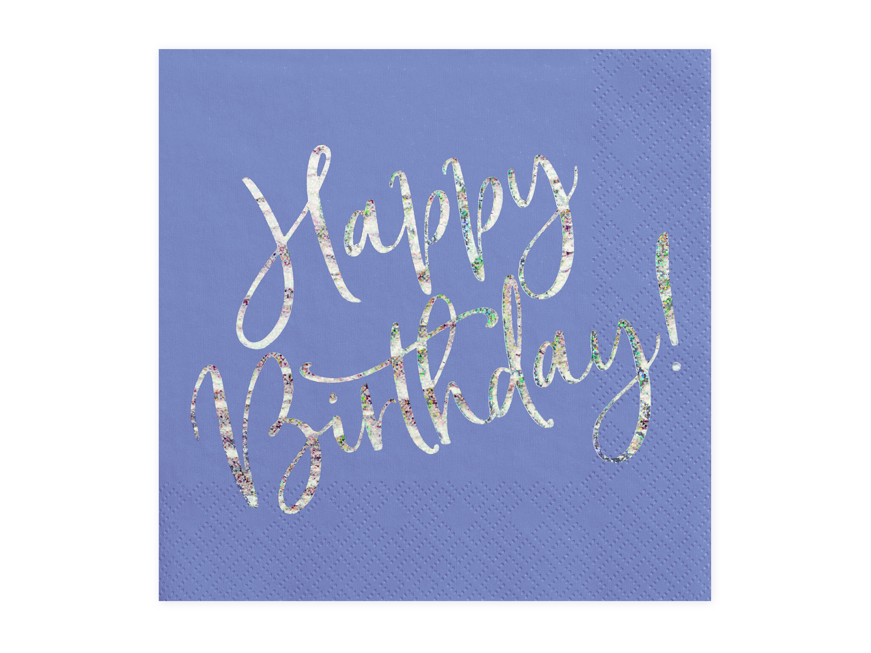 Papírové ubrousky v modré barvě s lesklým potiskem Happy Birthday, velikost po složení je 33 x 33 cm